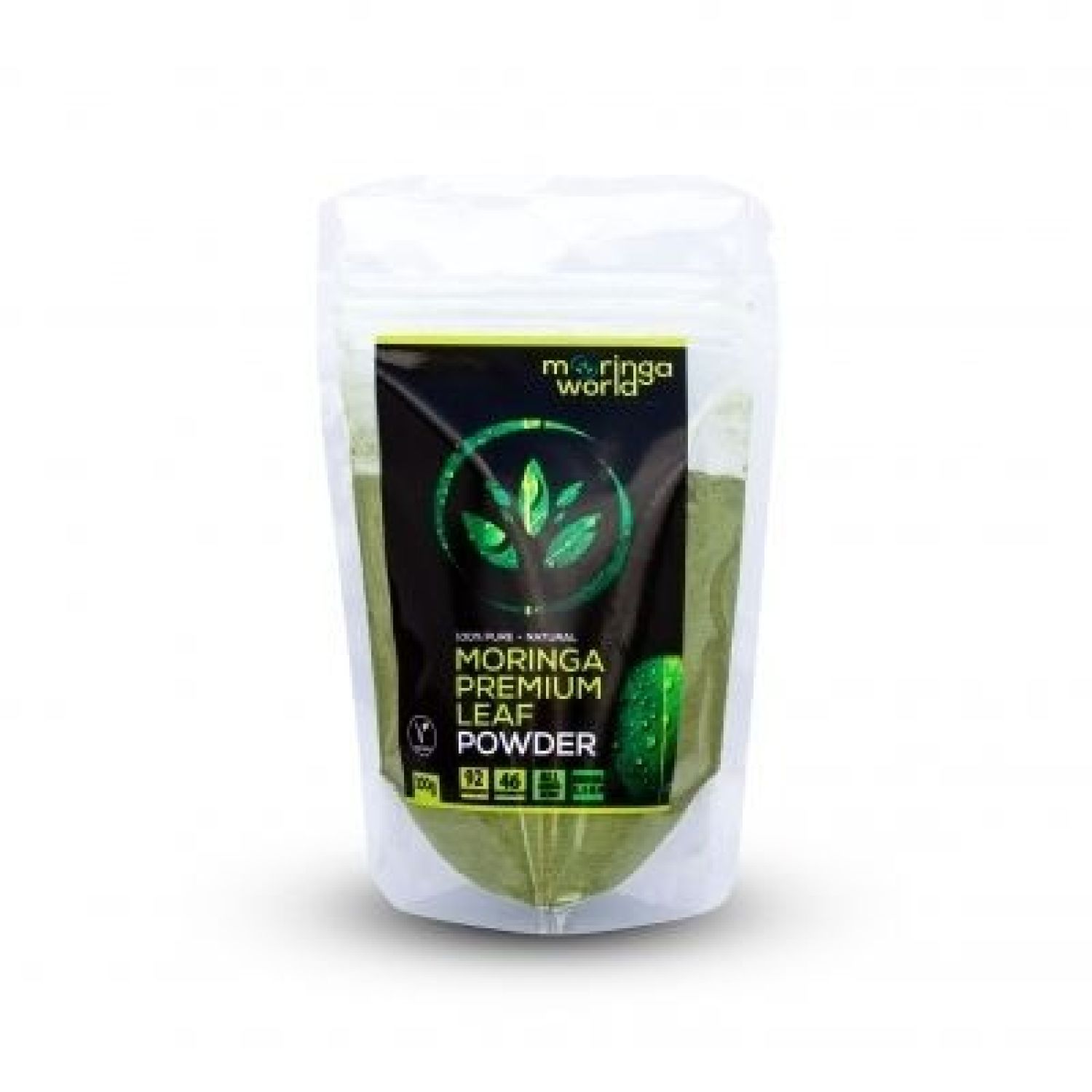The moringa stand-up pouch. One month's supply excellent for individual use. Bags are resealable.