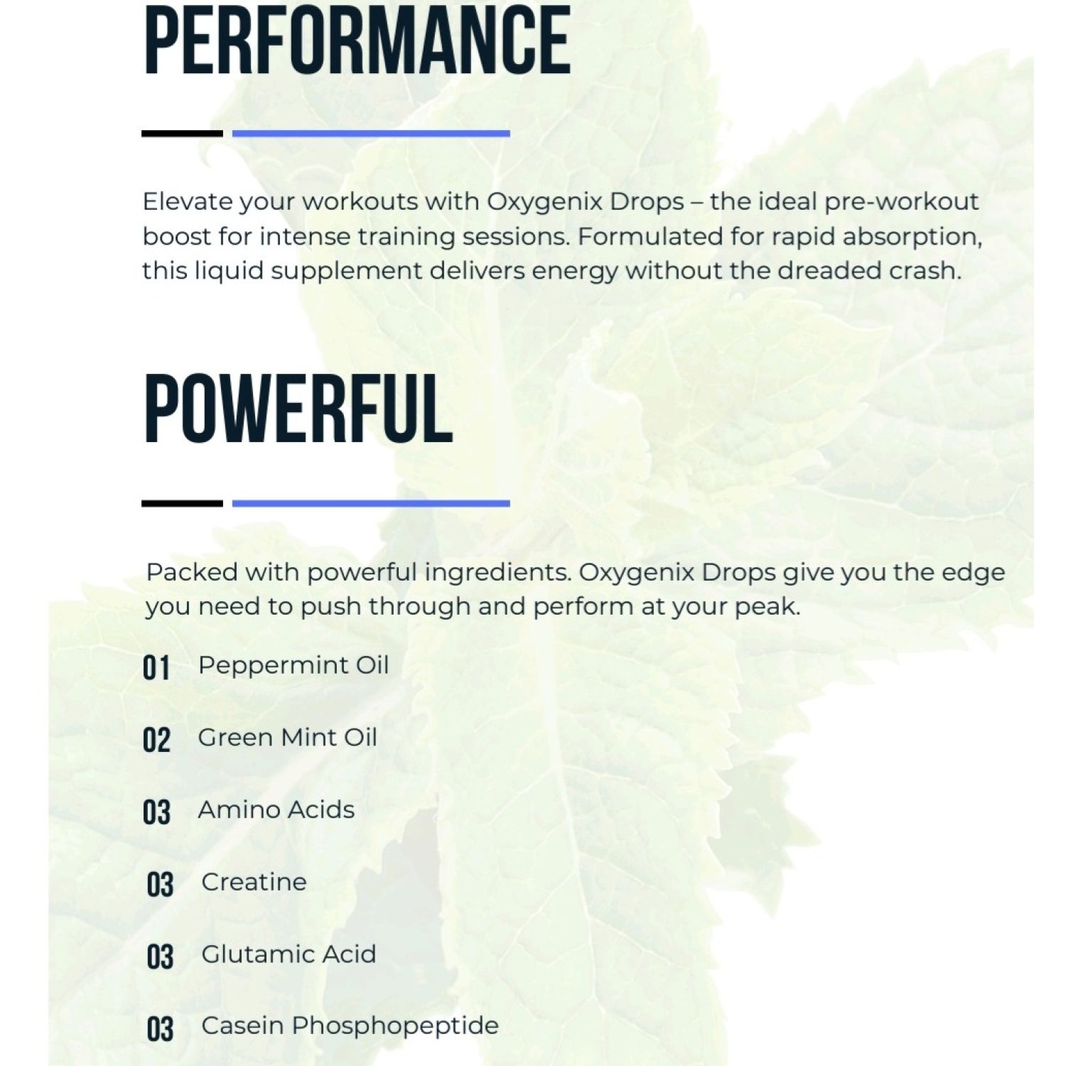 OxyGenix Drops: Peppermint Oil, Green Mint Oil, Glacial Menthe, Caprylic Triglycerides, MCT Energy from Coconut Oil, Amino Acids, Creatine, Glutamic Acid, Casein Phosphopeptide from Coconut Oil.