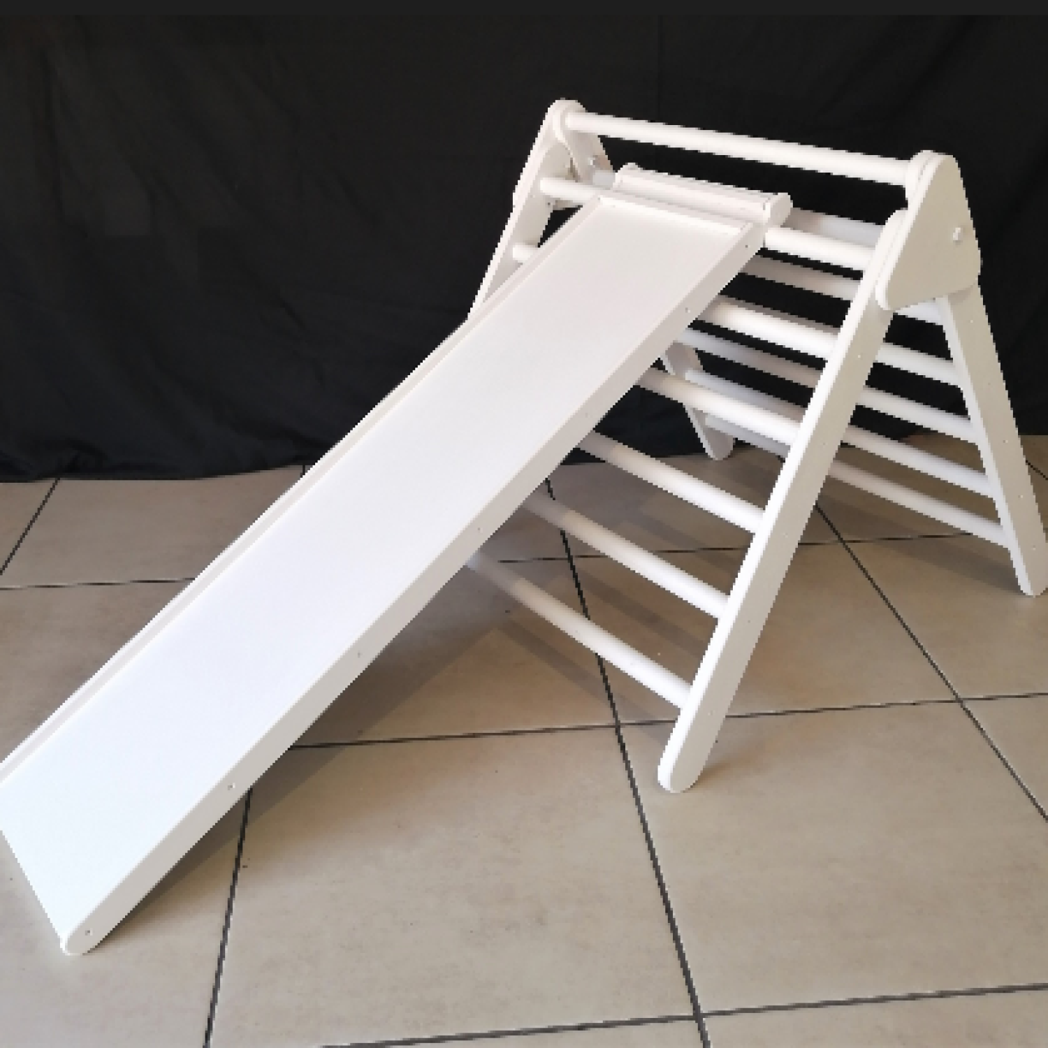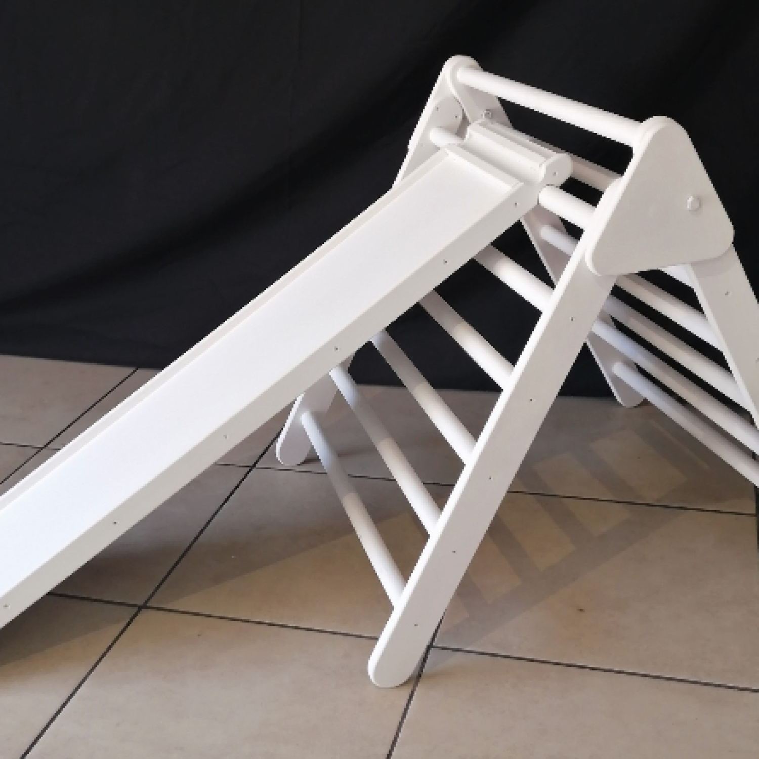 This top quality Montessori foldable wooden climbing frame, known as a Pikler Triangle, has a removable double-sided slide and rock-climbing ramp, to help toddlers develop and improve their gross motor development and creative play skills. It's position can be adjusted to any height and angle on the triangle.