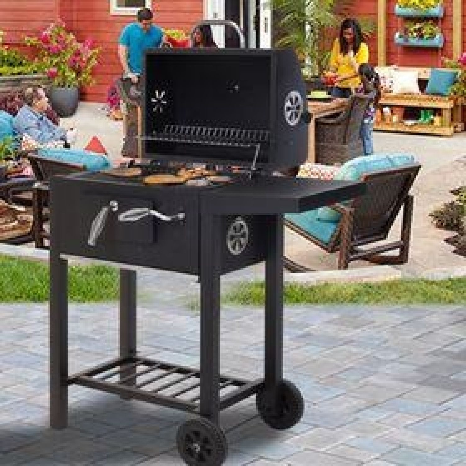 With a stylish black finish, this American Grill Charcoal BBQ is an outdoor cooking solution that looks great in any garden. The charcoal tray is easily adjustable using the 6 level gear system, allowing you to cook your food perfectly to your taste. The enamel cooking grill and warming rack help you to keep food warm until it's ready to be eaten, while the front door makes it simple to refill the charcoal. For added stability, the Charcoal BBQ Grill features sturdy legs, plus wheels for easy maneuverability as well as a handy shelf underneath the unit for added practicality.