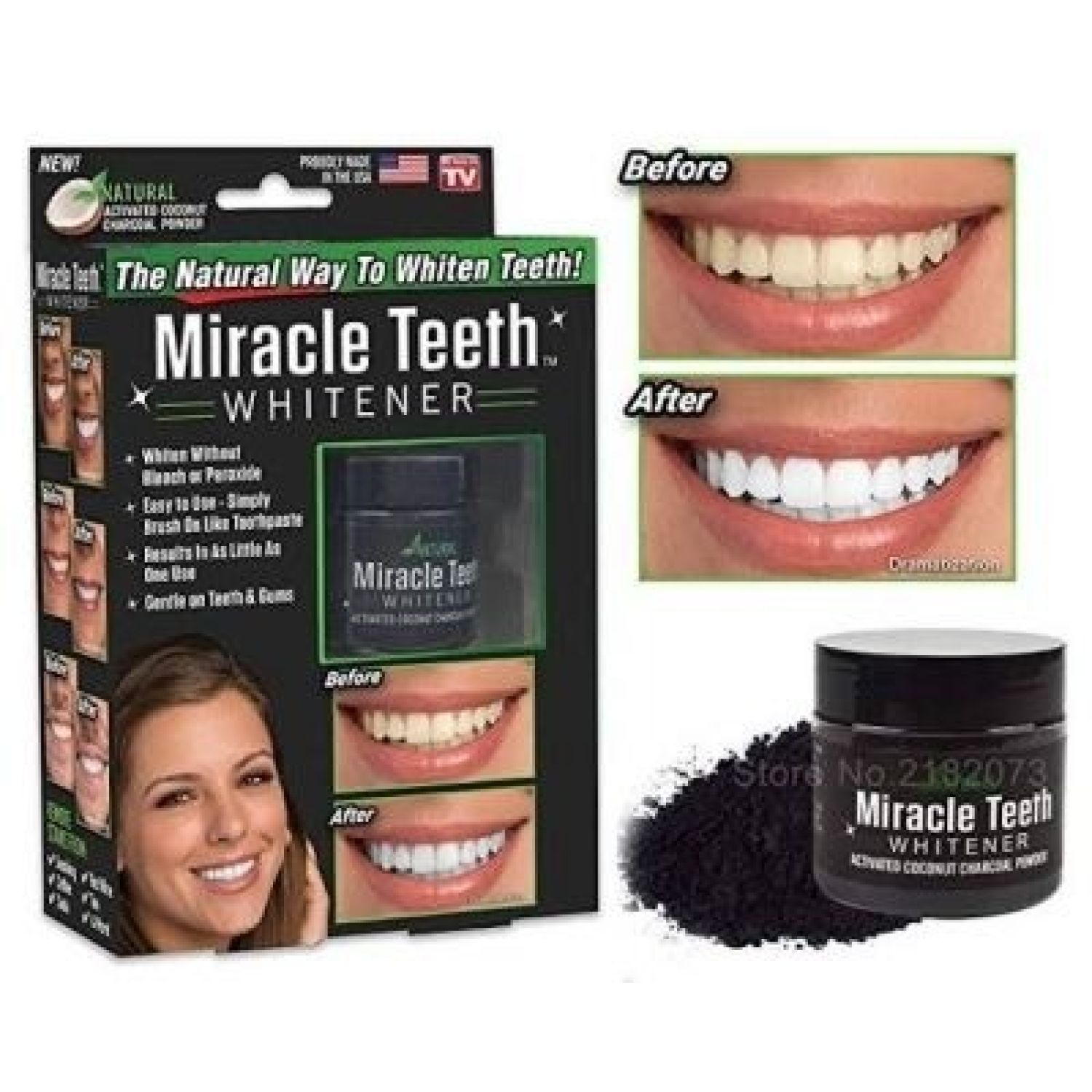 This miracle teeth whitener is the natural way to whiten teeth. It whitens without bleach or whitening peroxides. It's easy to use. Just brush on like toothpaste. It's gentle on gums and sensitive teeth. The secret is in the activated coconuts charcoal powder. It's great for removing stains caused by smoking, coffee, soda, red wine, tea and more. We have one goal with this charcoal teeth whitening powder and that is to provide you with an easy to use a product that's natural, yet works extremely well in helping you achieve a smile you can be proud of. Features - Organic - Completely natural and gentle on teeth and gums. - Made of natural activated coconut charcoal, bentonite powder, and orange seed oil. - Gently Whitens without bleach or whitening peroxides. Get beautiful, bright white teeth naturally. - Quickly & Easily whiten teeth that have been stained by smoking, coffee, soda, red wine & more. Instant Results! The more you use it, the whiter your teeth will get! Ingredients - 65% coconut shell carbon - 27% sodium bicarbonate - 2% bentonite clay - 2% peppermint oil - 2% orange oil How to use 1. Slightly wet toothbrush. 2. Dip toothbrush into charcoal powder. 3. Brush gently for 1-2 minutes, paying special attention to stained teeth. 4. Rinse mouth well with water. (you can follow-up with your normal toothpaste)