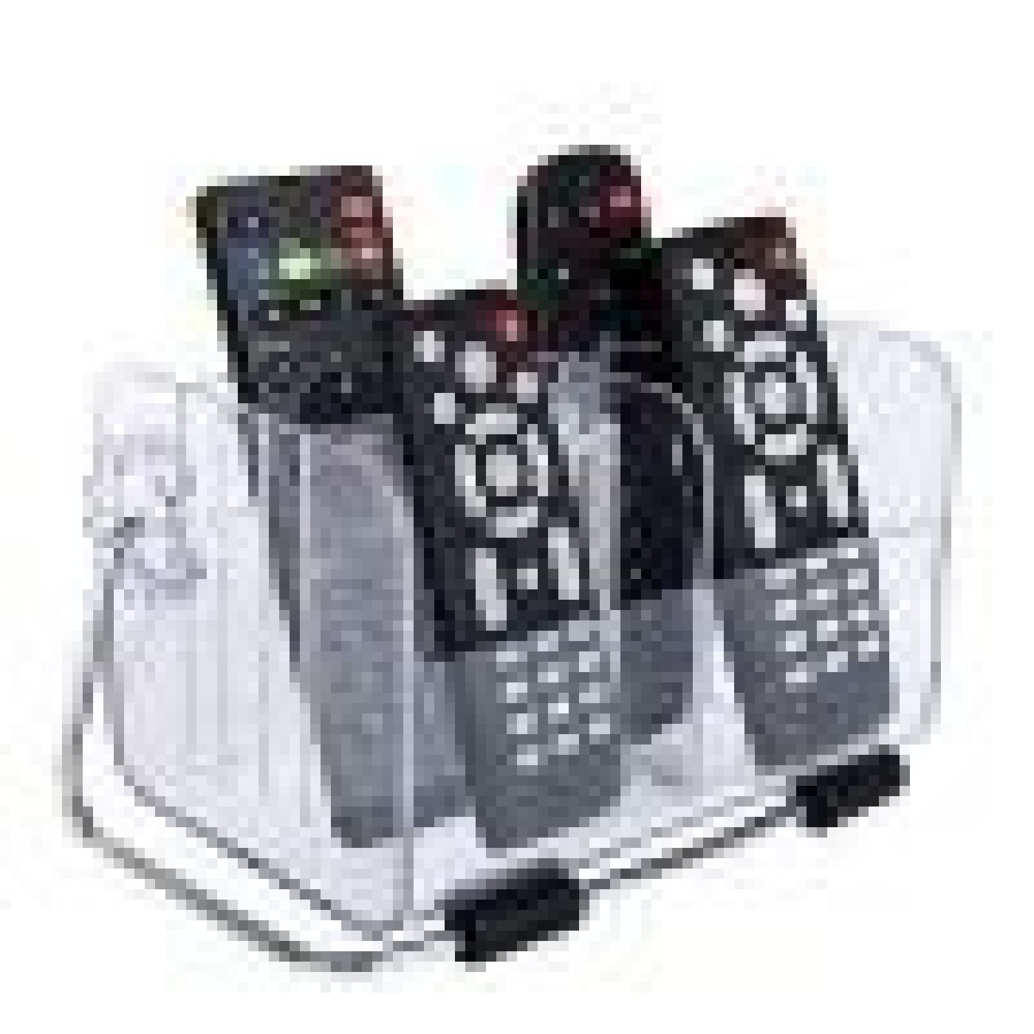 Remote Control Stand Unique designed Desktop remote control holder Holds up to 6 remote/Mobile handsets Acrylic and Metal construction No more missing remotes, The perfect gift Measures approximately 15.5cm x 10.5cm x 9.5cm Excludes all accessories Measures approximately 15.5cm x 10.5cm x 9.5cm Holds between 4 and 6 Remotes