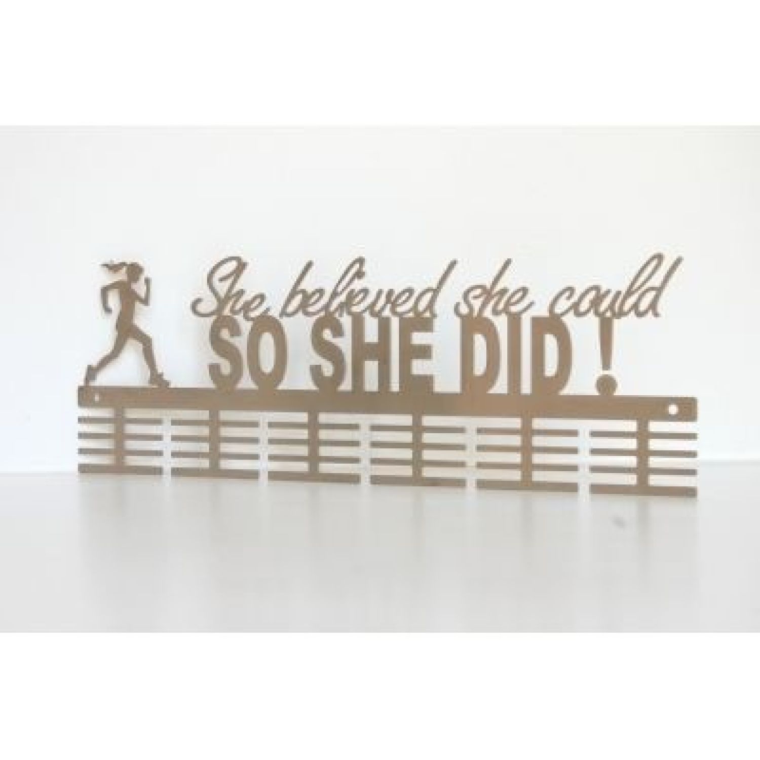 The She believed she could so she did! medal hanger holds 48 medals and comes with the necessary screws, spacers and plugs for easy installation of your medal hanger.