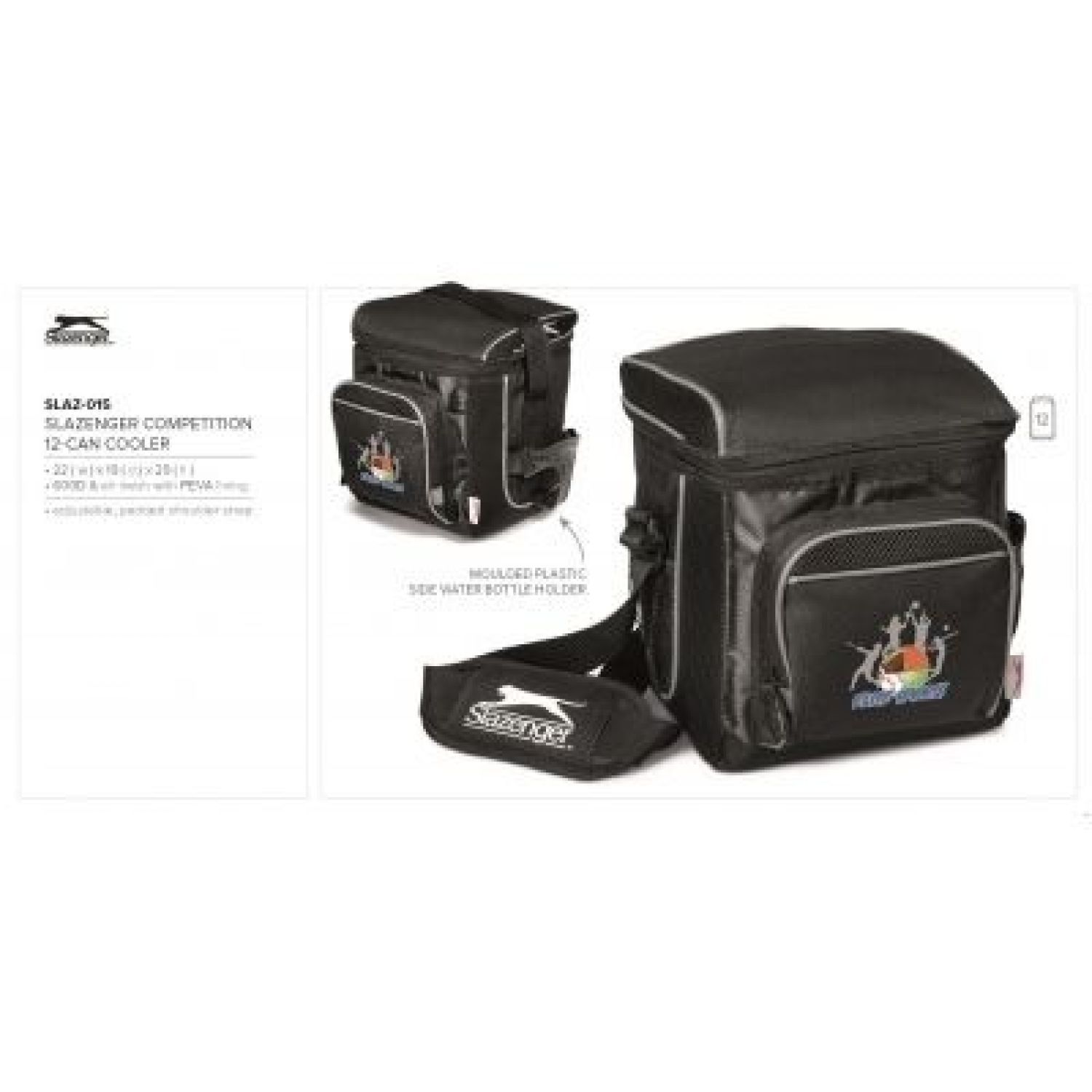 Slazenger Competition Cooler. 22 ( w ) x 19 ( d ) x 29 ( h ) 600D & air mesh with PEVA lining • adjustable, padded shoulder strap. A stylish high quality cooler great for picnics and outings. Features: Zippered main compartment holds up to 12 cans, large zippered front pocket, adjustable padded shoulder strap. Also features a unique futuristic moulded plastic water bottle holder on side. Insulated PEVA lining. Signature Slazenger branding • 600D & air mesh / PEVA lining