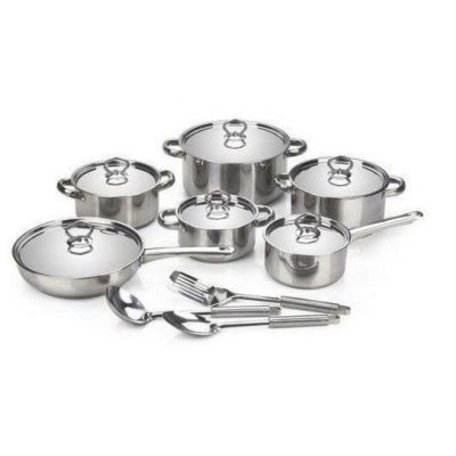 Features:- This 15-Piece Stainless Steel Cookware set is made of mirror-polished stainless steel with a capsuled aluminum disc in the bottom.- Aluminum disc layer for heat distribution; Riveted handles and are comfortable to hold.- Induction compatible; Works on gas, electric, glass, ceramic, halogen, etc.; Dishwasher safe.