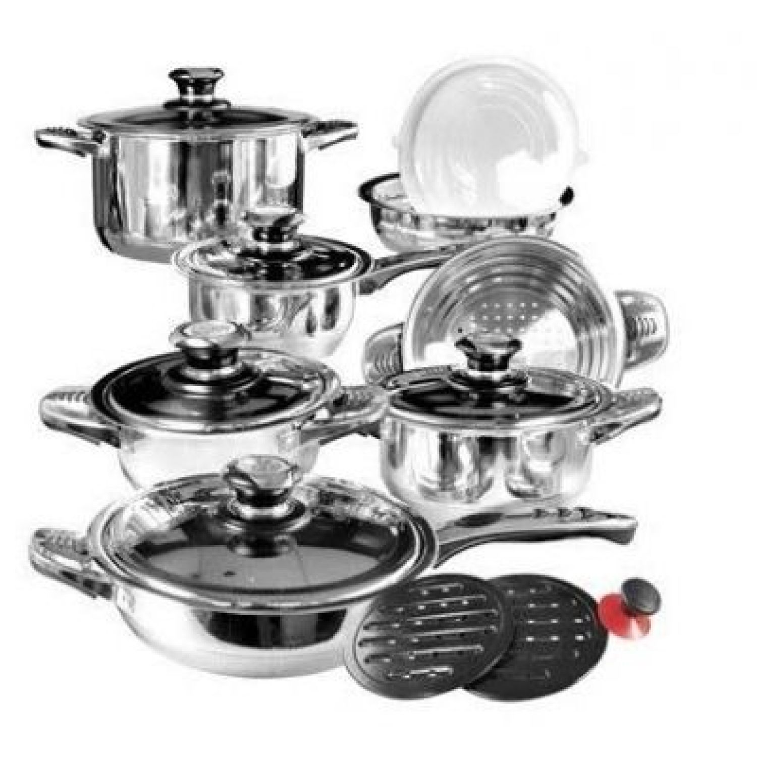 All the above Pots + Lids + Mixing bowl and accessories make 16 pieces.