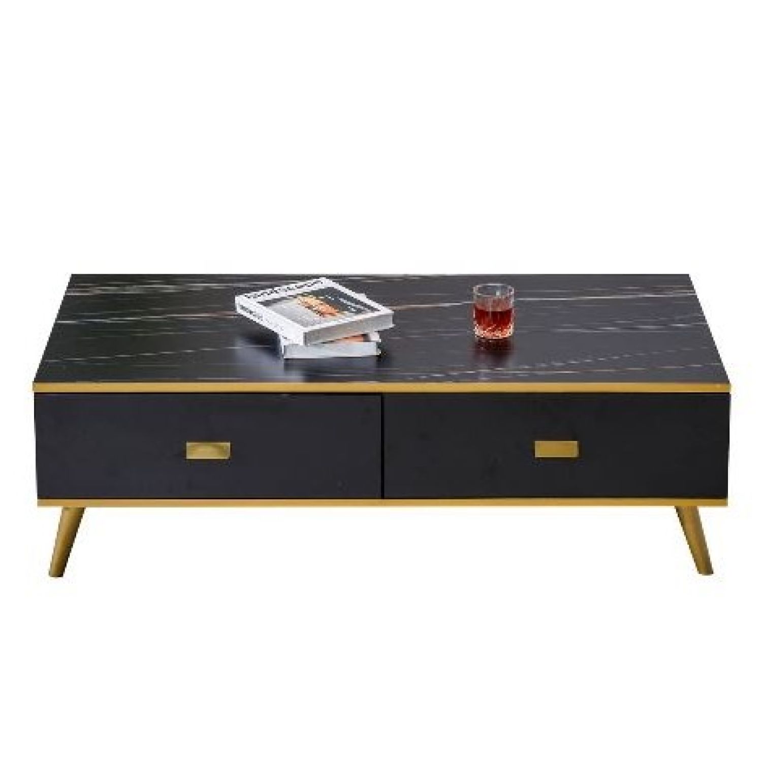This Sunniva wooden coffee table desktop stands out with its realistic marble texture and golden frame, adding a touch of luxury to your space and elevating the sophistication of your office or home.There are four drawers under the table, providing plenty of storage space, remote controls, game handles, books, blankets, etc. can all be orderly accommodated and protect against dust while keeping frequently used items within easy reach.