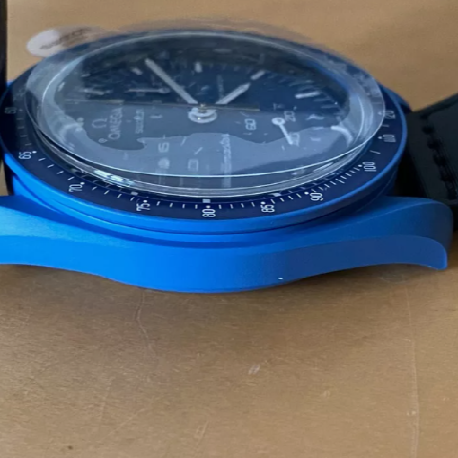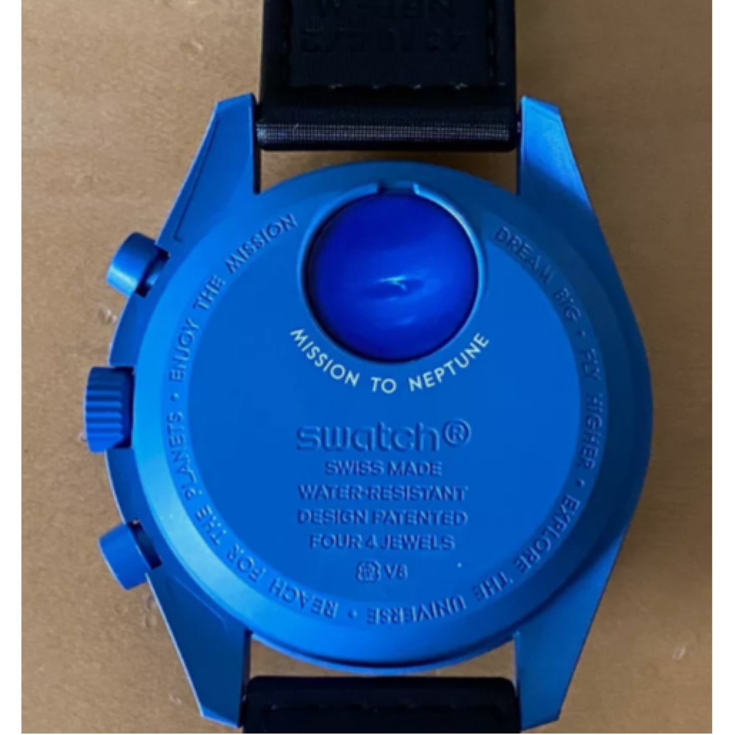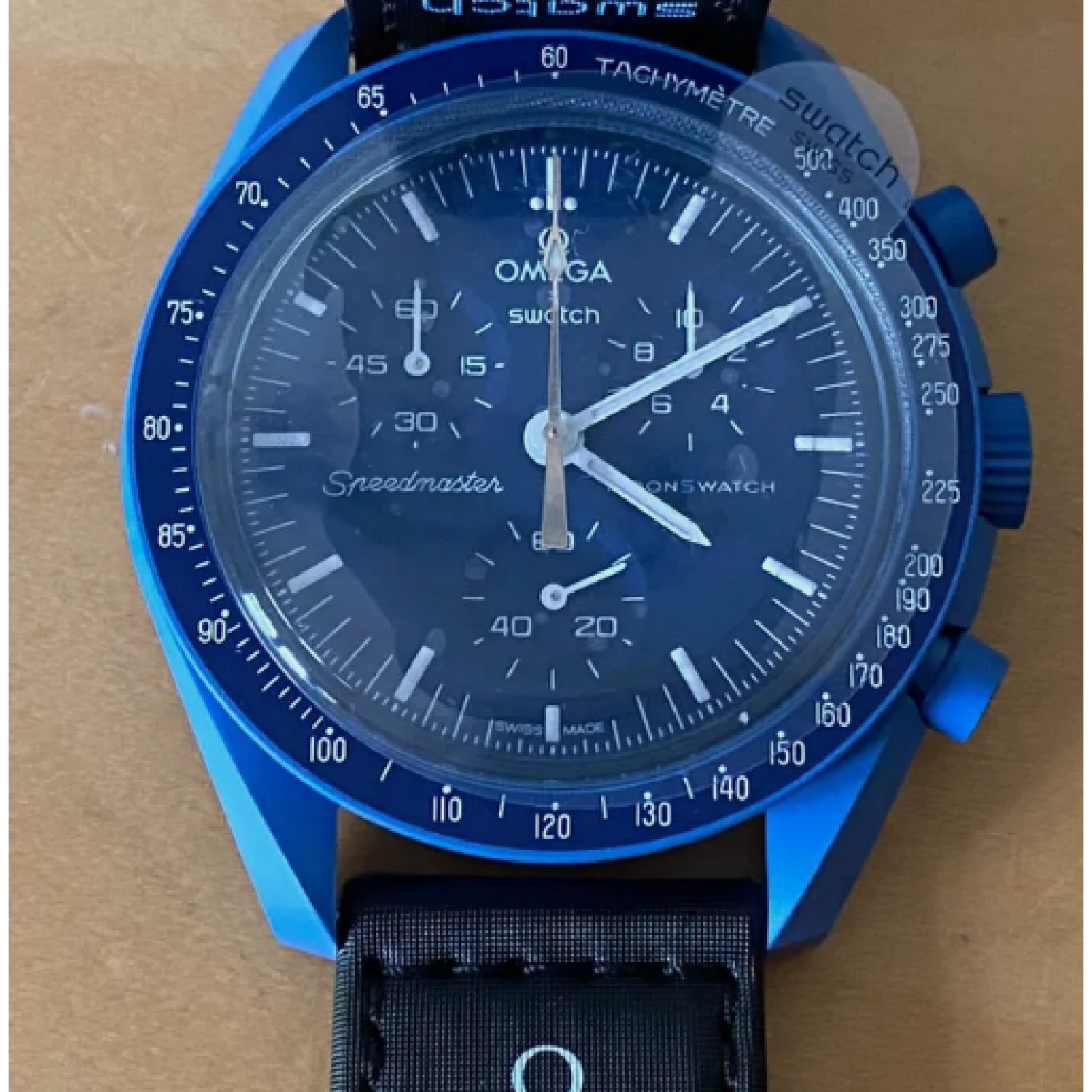This model combines deep navy-blue tones with the black hue of the VELCRO© strap. For contrast, the chronograph's seconds hand, subdial hands and tachymeter scale are in white. All dials carry the OMEGA X Swatch branding, as well as the iconic Speedmaster logo and the new MoonSwatch logo. The biosourced glass construction, the hidden S integrated in the center of the crystal, the fine and sophisticated circular pattern on the dial outer ring and the recessed subdials, the sharp and smooth lugs construction, the iconic dot over 90 detail on the tachymeter scaled bezel, and of course the unique Bioceramic touch are common to all models. All hours, minutes, chronograph seconds hands and hour markers sport Super-LumiNova® for a perfect glow in the dark.