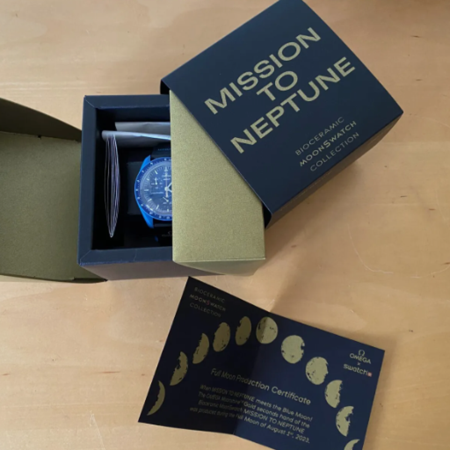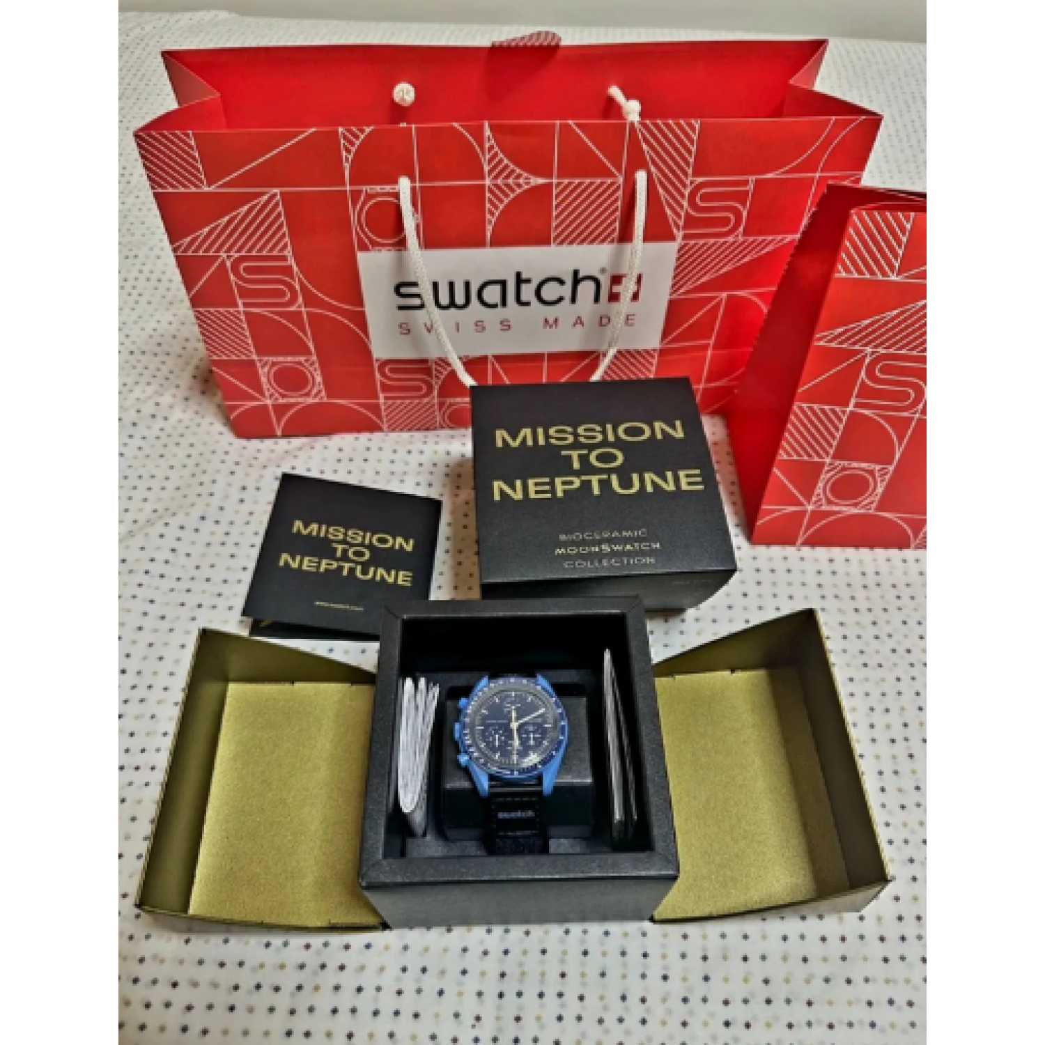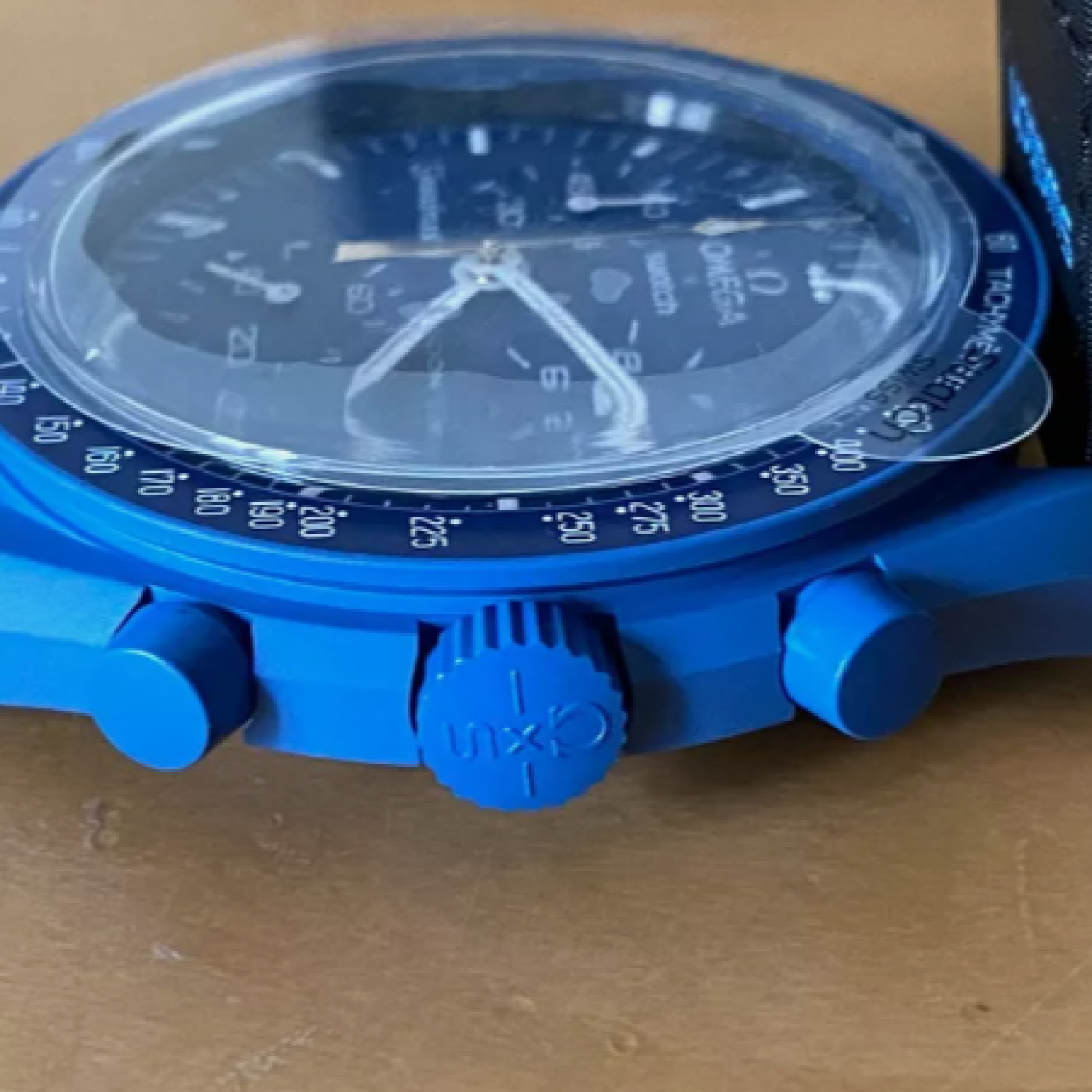 This model combines deep navy-blue tones with the black hue of the VELCRO© strap. For contrast, the chronograph's seconds hand, subdial hands and tachymeter scale are in white. All dials carry the OMEGA X Swatch branding, as well as the iconic Speedmaster logo and the new MoonSwatch logo. The biosourced glass construction, the hidden S integrated in the center of the crystal, the fine and sophisticated circular pattern on the dial outer ring and the recessed subdials, the sharp and smooth lugs construction, the iconic dot over 90 detail on the tachymeter scaled bezel, and of course the unique Bioceramic touch are common to all models. All hours, minutes, chronograph seconds hands and hour markers sport Super-LumiNova® for a perfect glow in the dark.