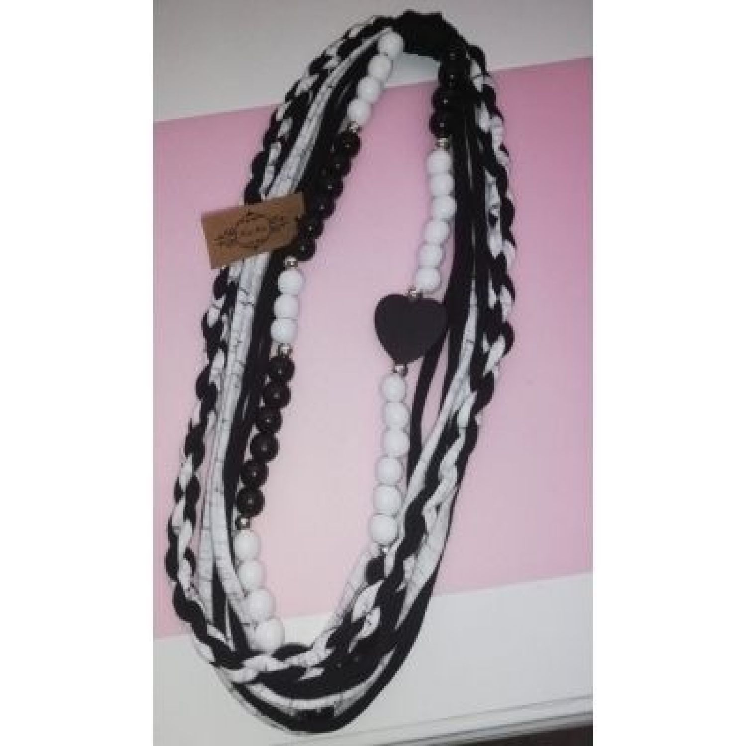 Standard Handmade T-Shirt Necklace with wooded beads and wooded beaded heart. Black/White