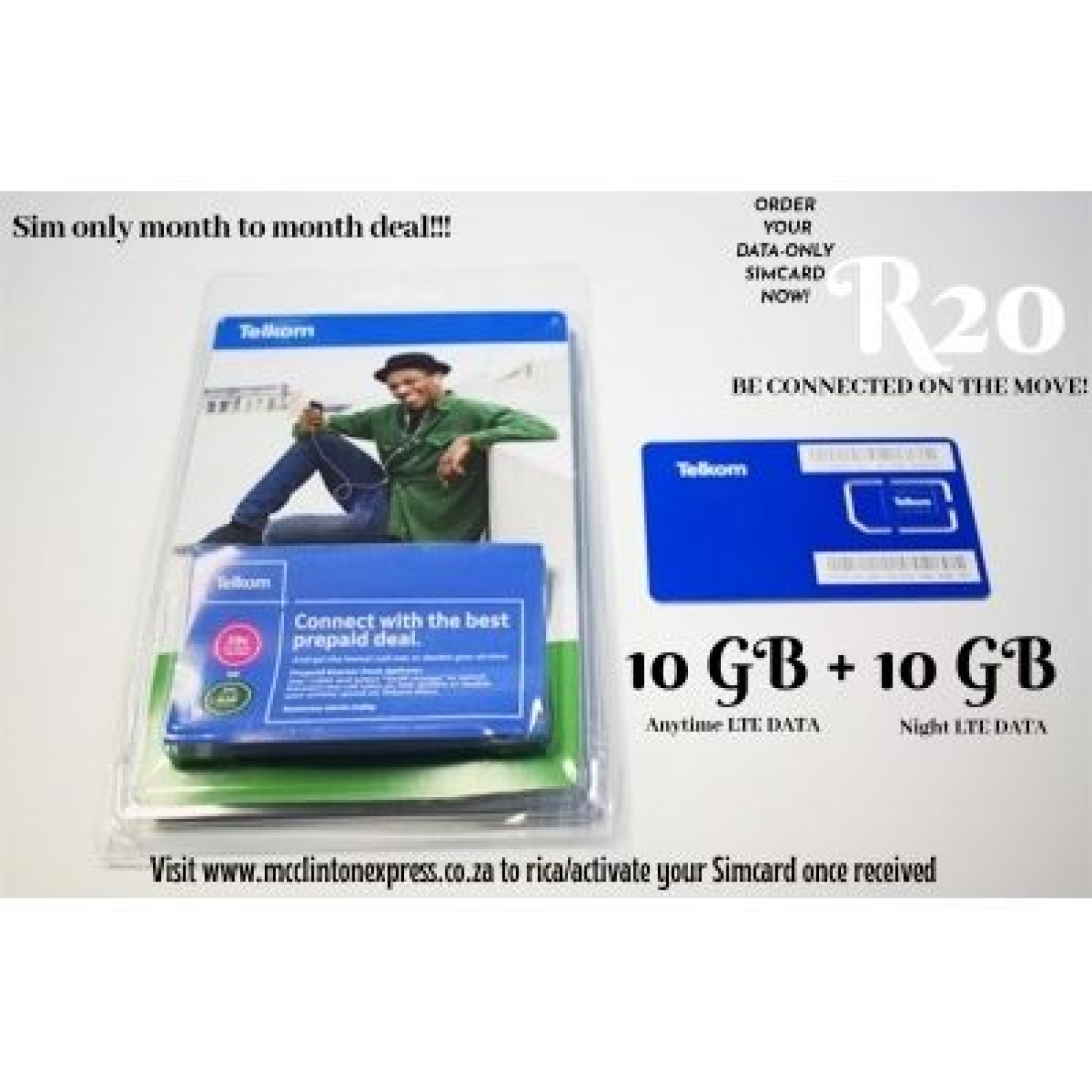 10GB +10GB Telkom LTE smartbroadband DATA-ONLY simcard allows you to be connected on move! For only R130.00 a month.