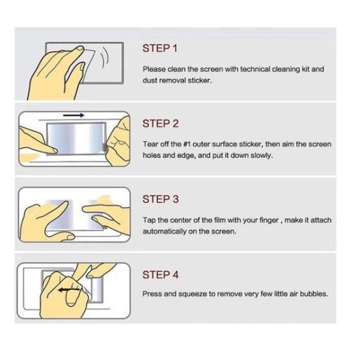 1. Clean the LCD screen thoroughly using an alcohol wipe and microfiber cloth. A dust sticker is also included for easy use.