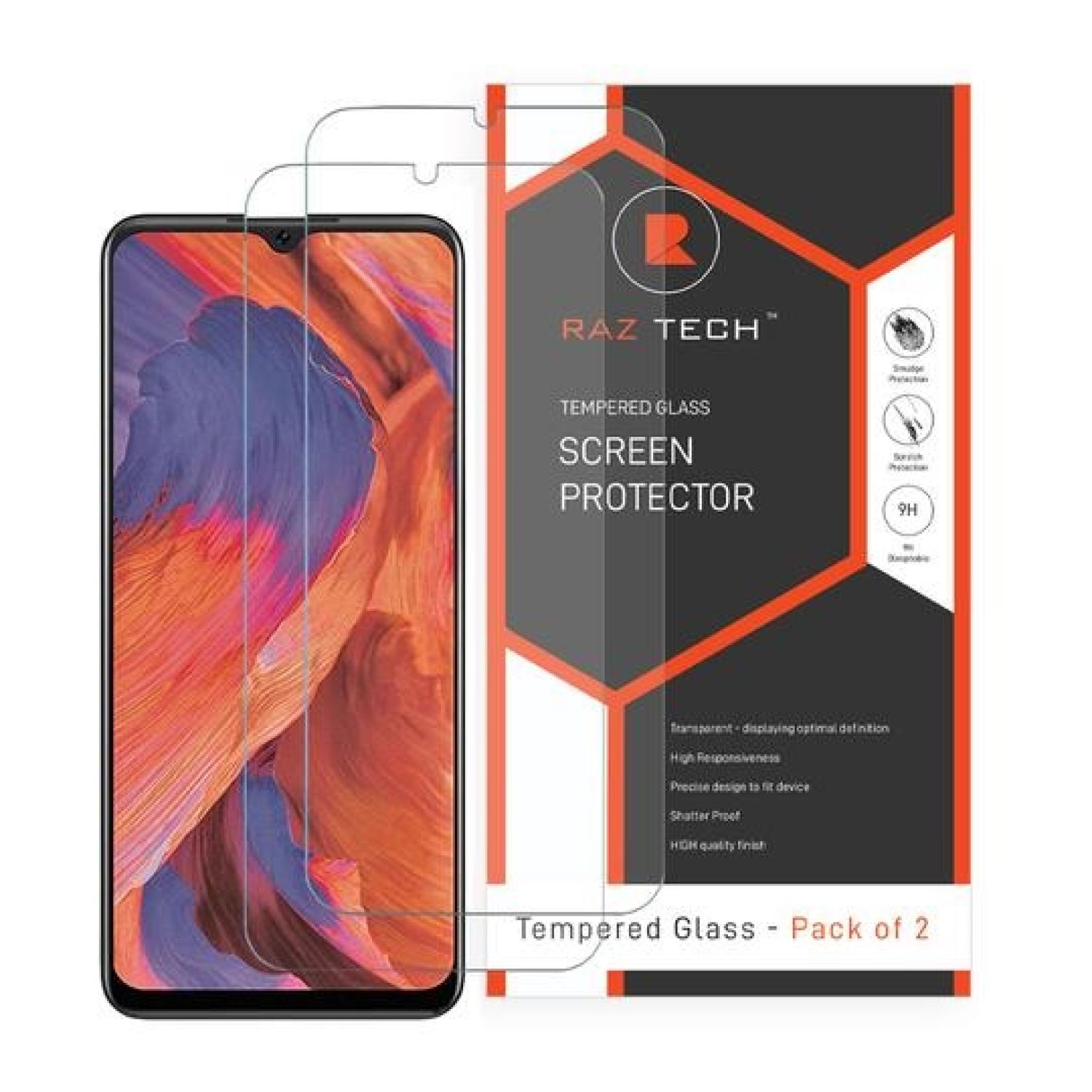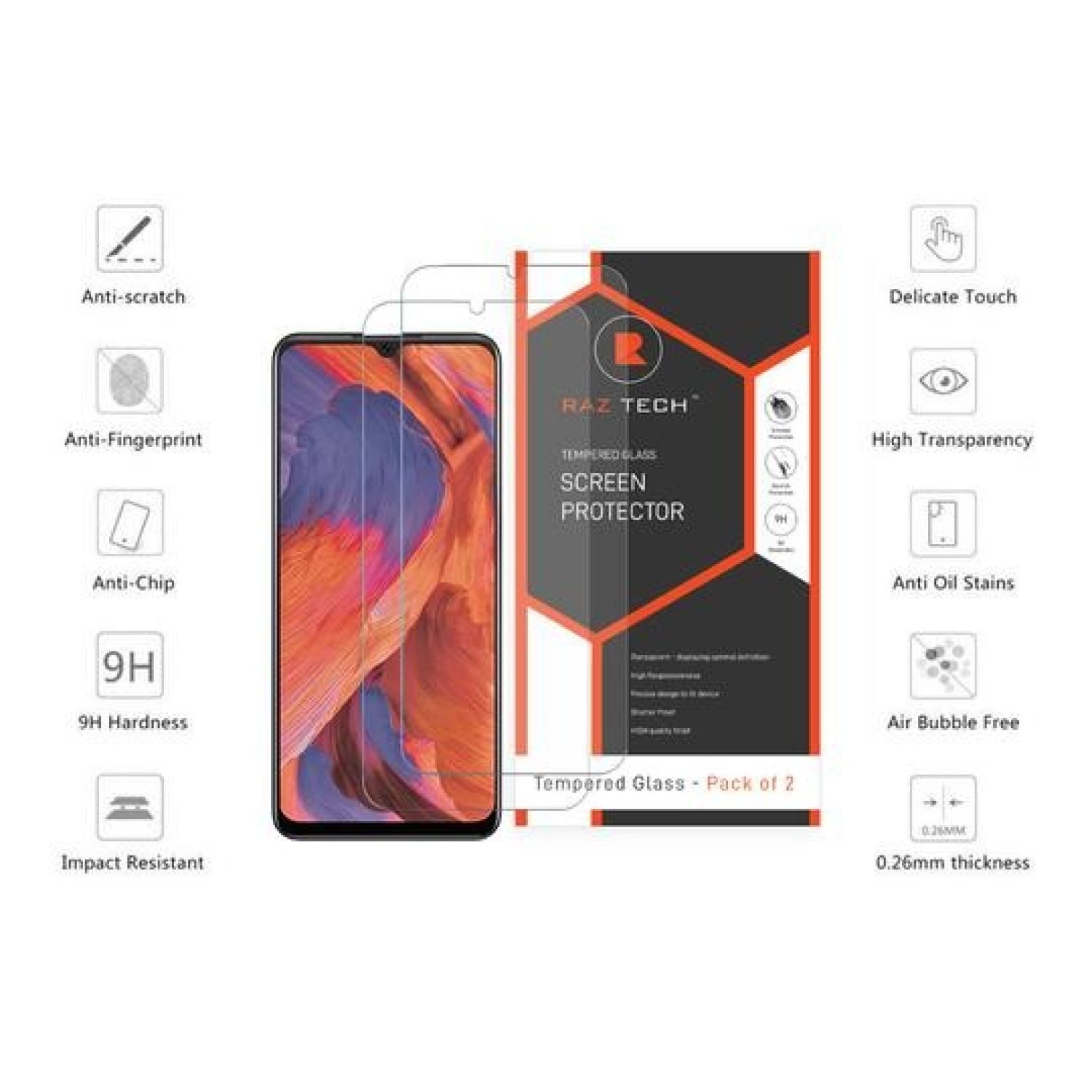 The Raz Tech Tempered glass will Safeguard the display of your device with this Screen Protector which is constructed from 9H Tempered Glass for the highest durability and impact-strength.