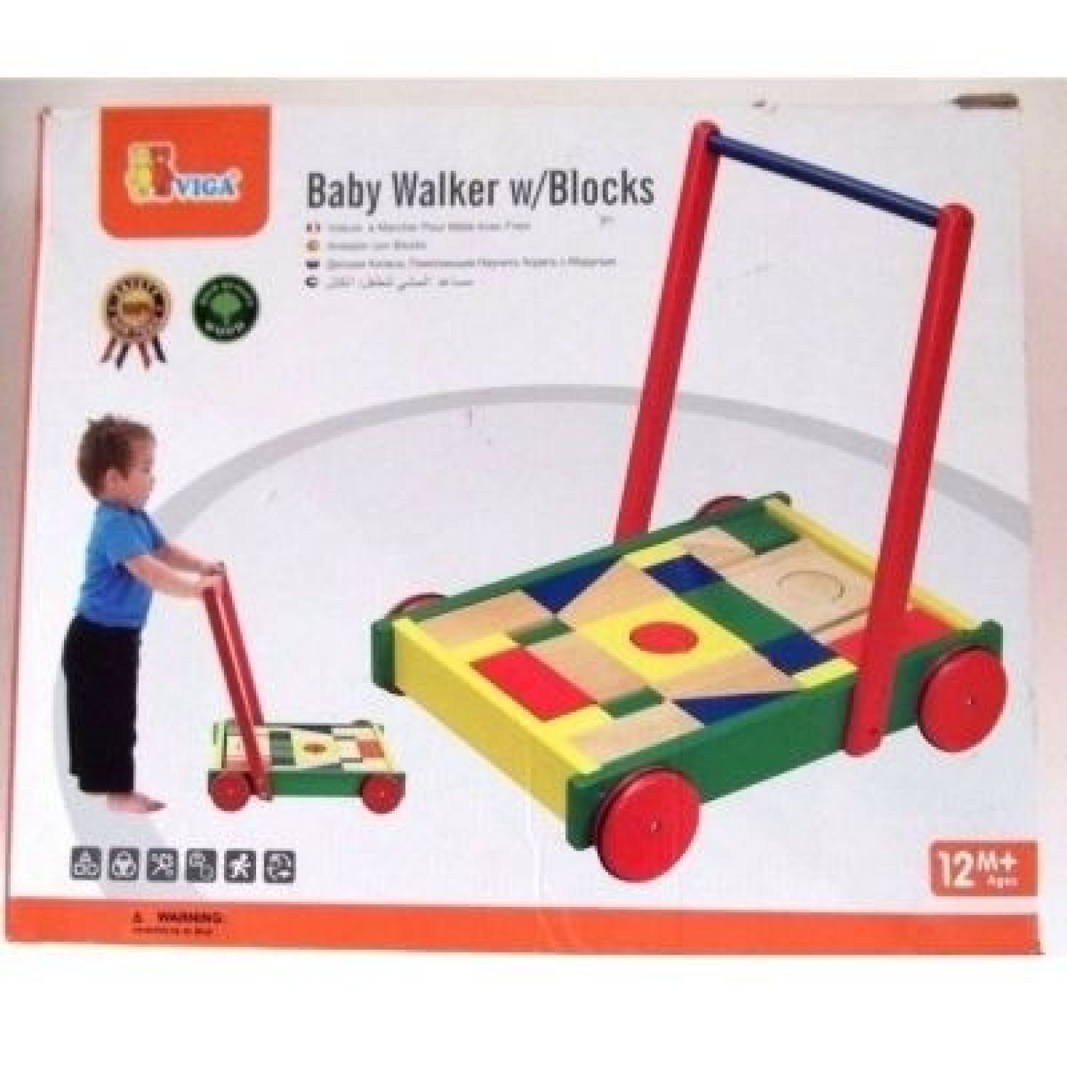 This classic, wood, push-along baby walker contains 36 pcs wooden blocks of solid colours and different shapes. Secure non-slip rubber ring on the wheel offers extra confidence.