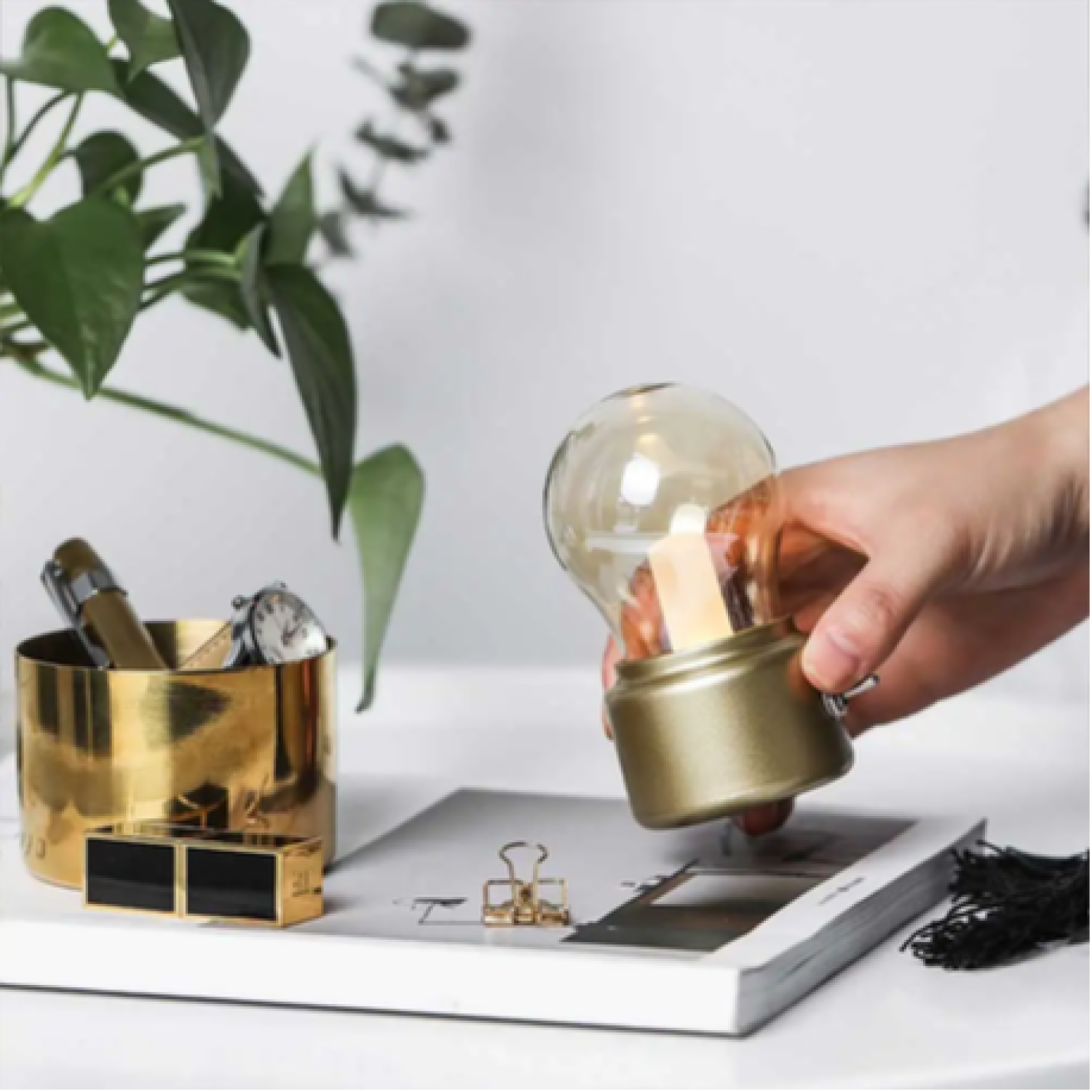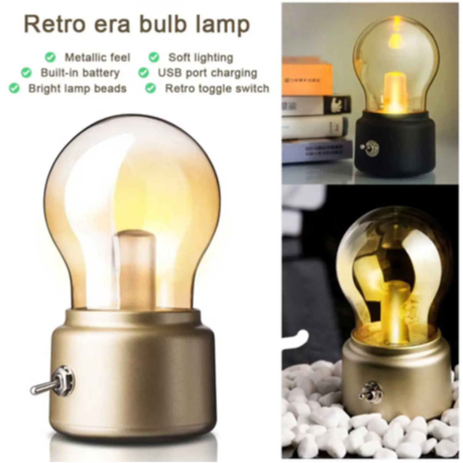 The Retro LED Desk Lamp combines a nostalgic aesthetic with modern functionality, making it an ideal addition to any home, office, or outdoor setting. This USB rechargeable desk lamp features a metallic-textured bulb design that emits soft, warm light to create a cozy and romantic atmosphere. Designed with durability and portability in mind, this energy-efficient lamp is perfect for use as a bedside light, decorative piece, or travel companion.