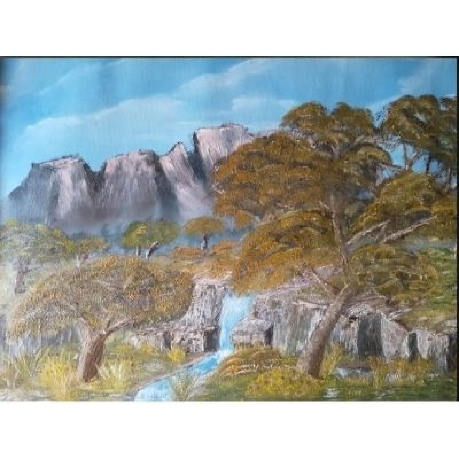 Original oil painting by Marius Nel, with soft colours seting you in the middle of a idyllic location between the mountains and trees. You can almost hear the sound of the river as it cascades through the painting.
