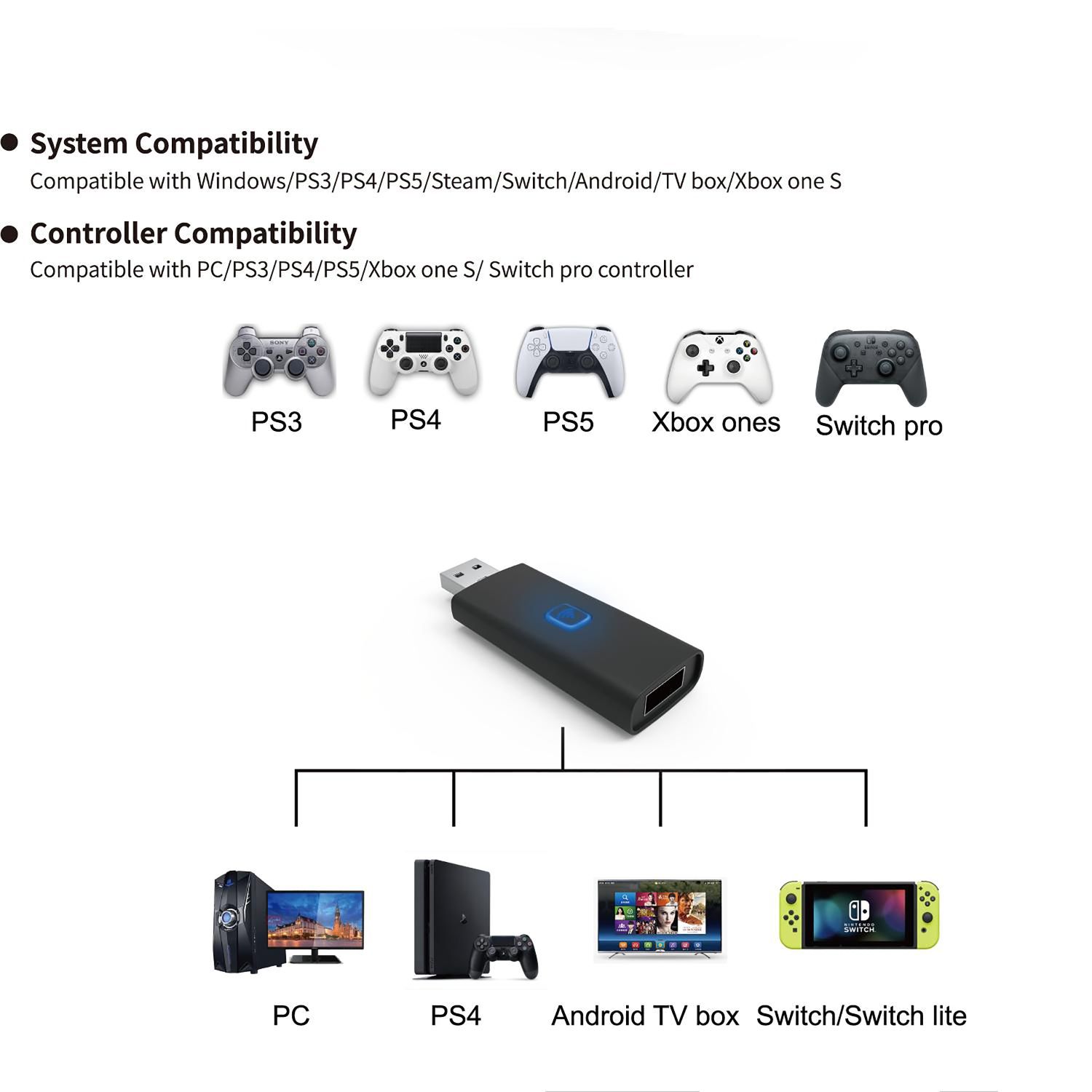 • For Bluetooth controllers Xboxones/Ps3/Ps4/Ps5, NS Switch Pro, Windows,Android TV DOK.